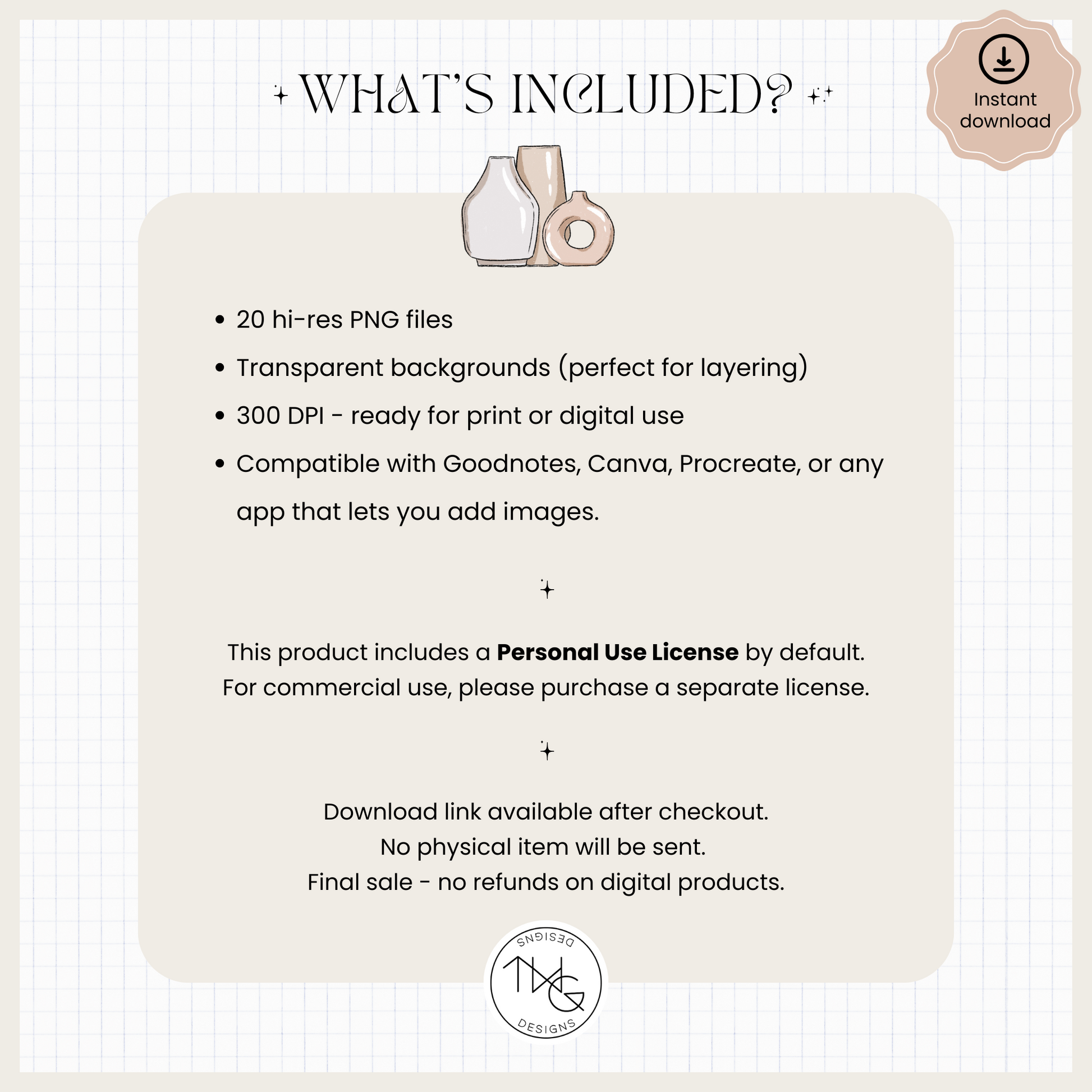 Each image in this bundle was thoughtfully illustrated by hand, bringing a unique, personal touch to your digital designs. This is exclusive artwork, not mass-produced or AI-generated.