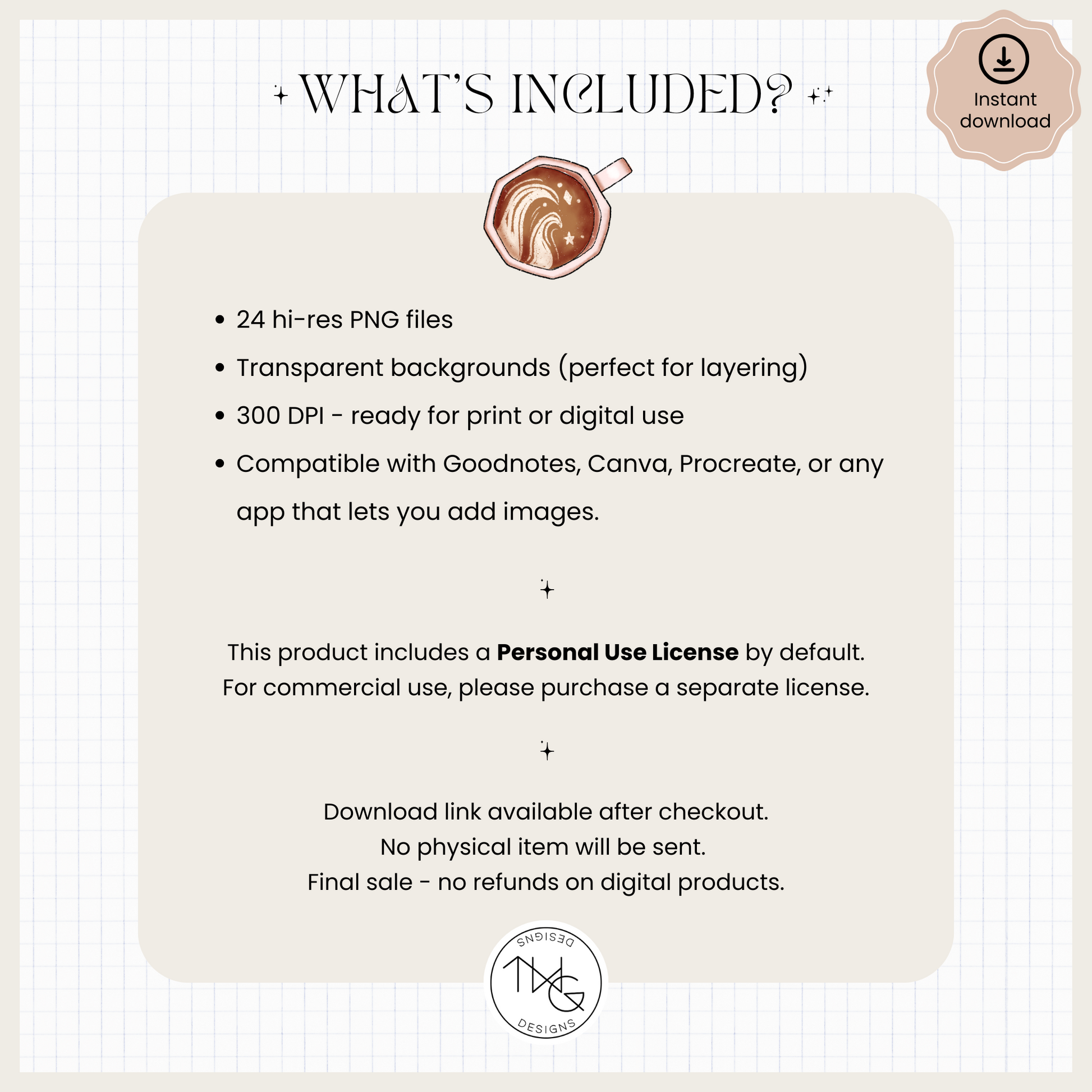 It’s a collection of cute, high-quality ready-to-use images (PNGs with transparent backgrounds) that you can drag and drop into your digital planner, journal, or designs - no special software, design skills, or experience needed!